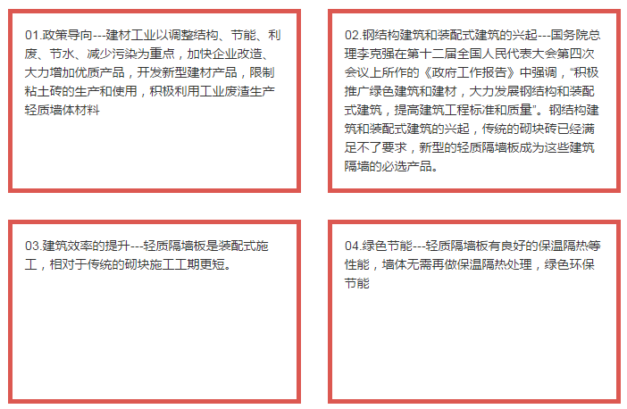 按照國家十三五規(guī)劃,至2020年,我國裝配式建筑要占全部建筑中的比重不低于30%,那么,在未來五年,新型裝配式墻體材料及相關(guān)產(chǎn)品將有幾十倍的增長。《國家"九五"計(jì)劃與2010年國家經(jīng)濟(jì)發(fā)展鋼要》再次強(qiáng)調(diào)"建材工業(yè)以調(diào)整結(jié)構(gòu)、節(jié)能、利廢、節(jié)水、減少污染為重點(diǎn),加快企業(yè)改造、大力增加優(yōu)質(zhì)產(chǎn)品,開發(fā)新型建材產(chǎn)品,限制粘土磚的生產(chǎn)和使用,積極利用工業(yè)廢渣生產(chǎn)輕質(zhì)墻體材料"。