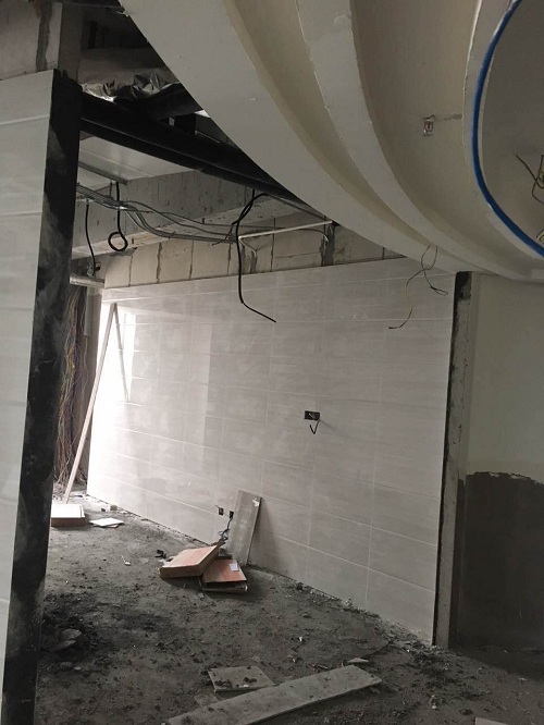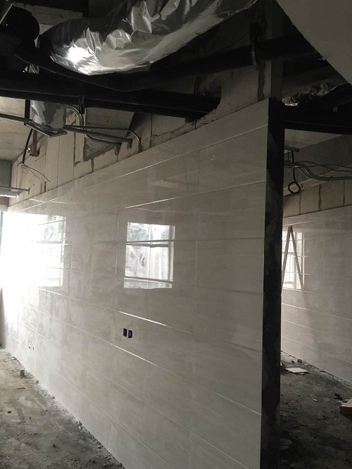 下圖是三峽大學仁和醫院輕質隔墻板完工后貼瓷磚的現場圖