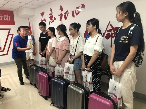 (為學生們送上拉桿箱以及企業紀念品)