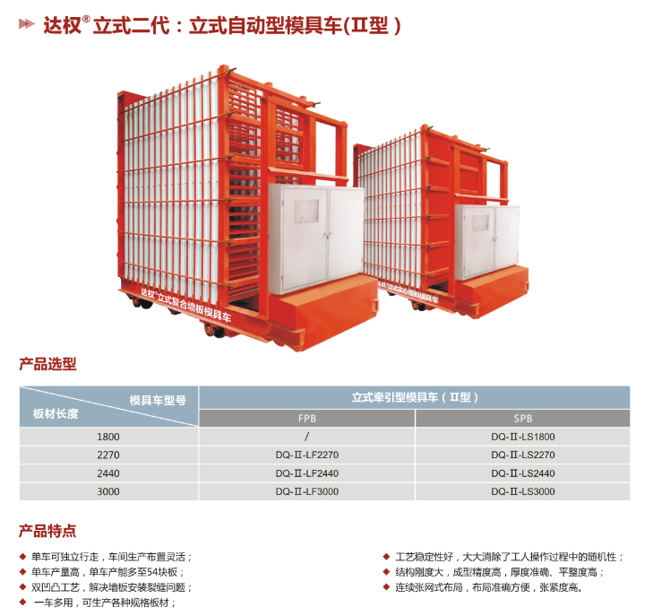 達權復合夾芯板立式模具車是達權首創的立式模具車,用于生產輕質復合夾芯板,改變了傳統的臥式模具車生產形式,相對于傳統復合夾芯板臥式車,立式模具車更利于倒模拆模,大大提高了生產效率,降低了人工成本。性能已達到國際同類產品的領先水平。免費提供本公司品牌、商標、工藝流程的技術培訓,為建廠公司(合作廠家)全方位提供生產、安裝、銷售的扶持及服務。